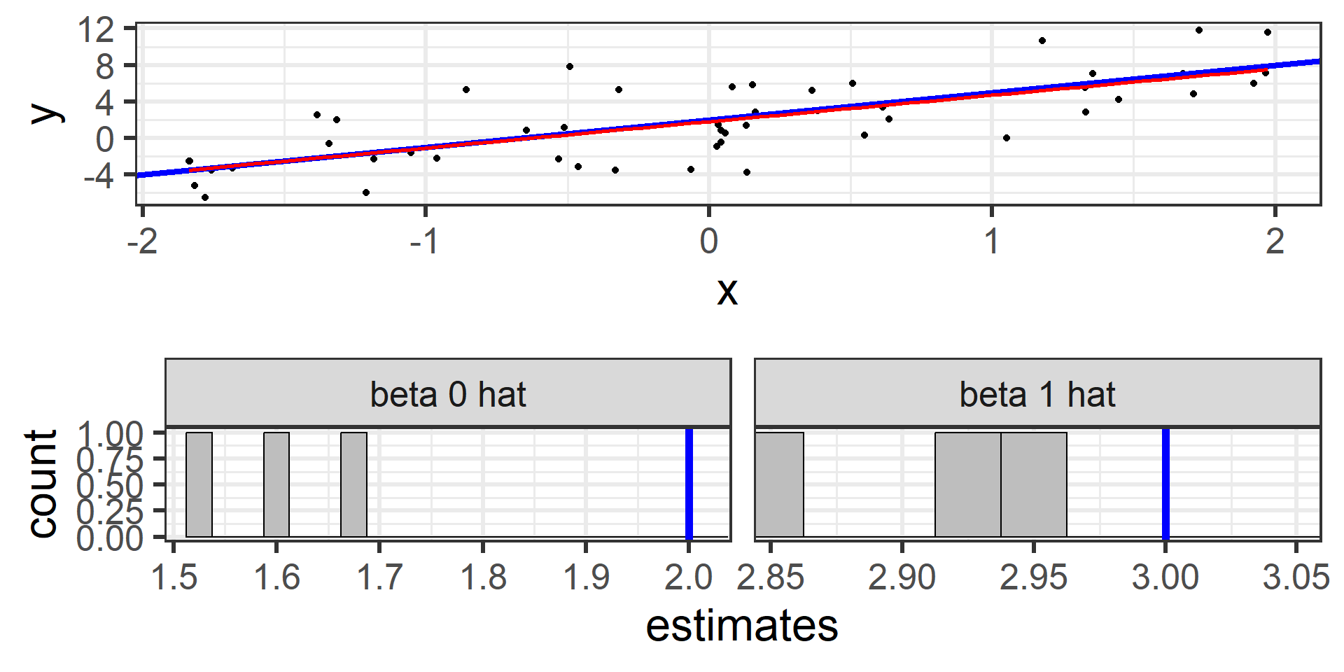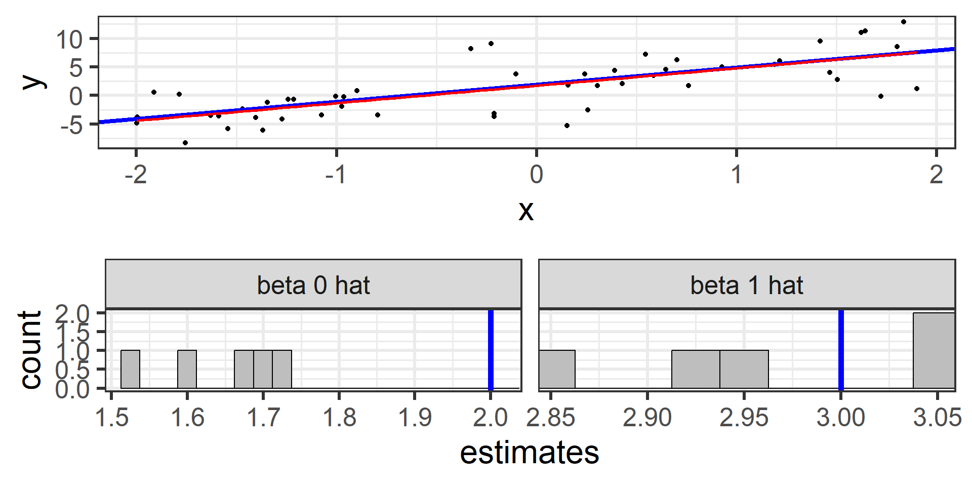 The least squares estimators \(\hat{\beta}_0\) and \(\hat{\beta}_1\) from many random samples will tend towards the true parameters \(\beta_0\) and \(\beta_1\).