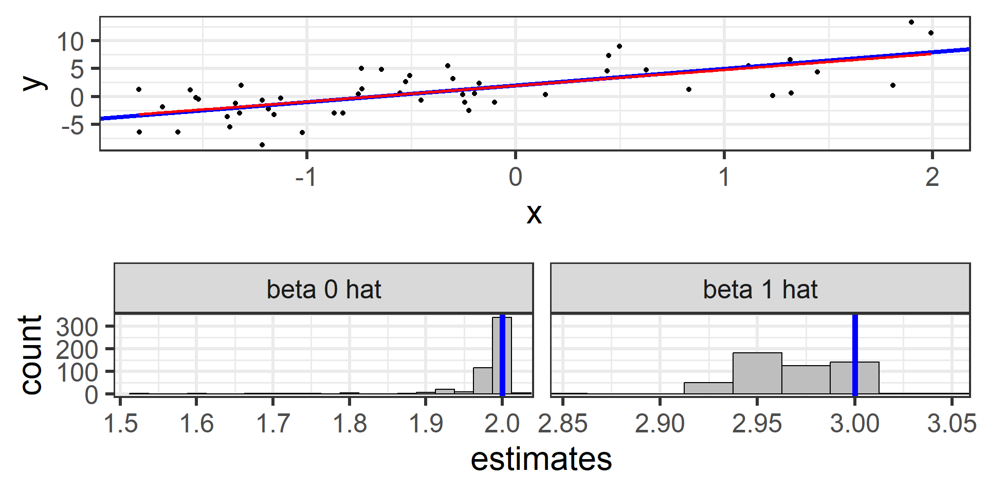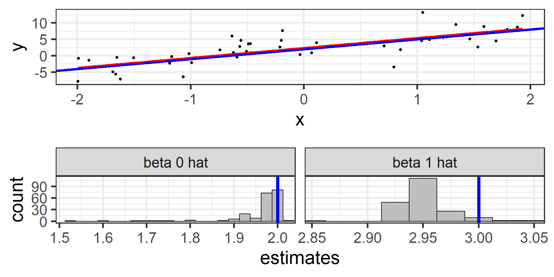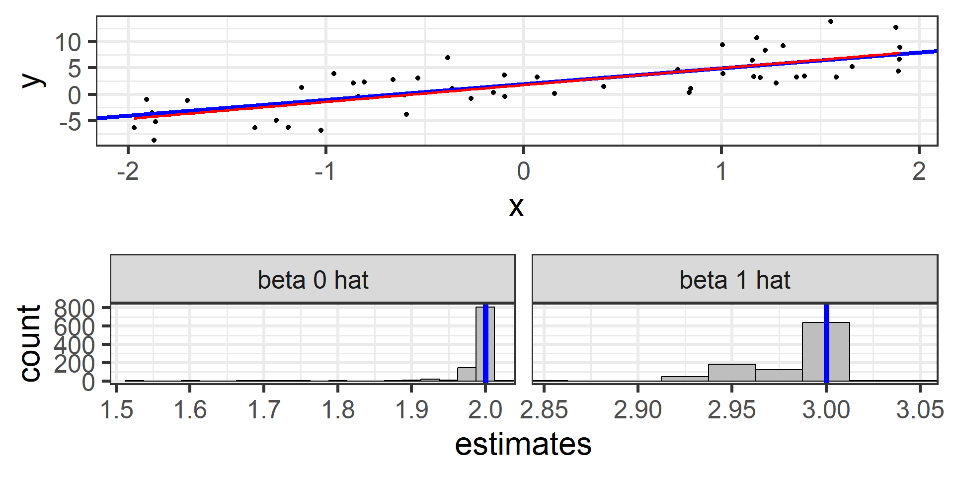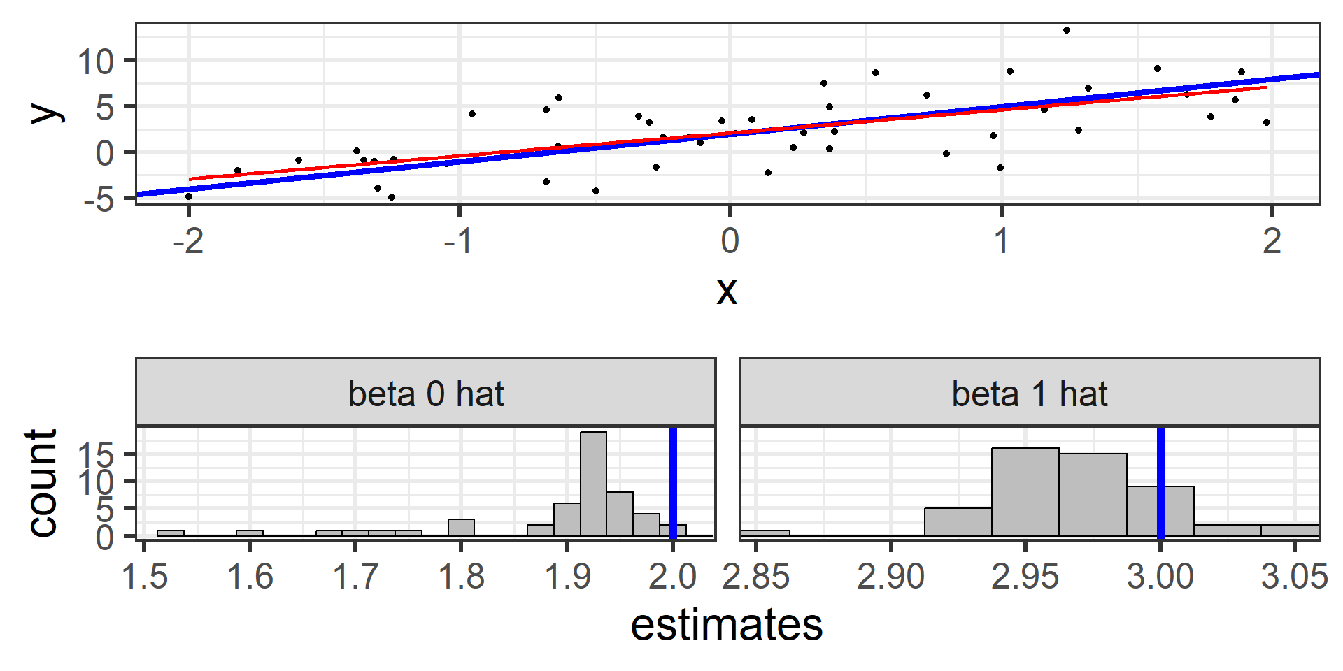 \(\hat{\beta}_0\) and \(\hat{\beta}_1\) are unbiased estimators for \(\beta_0\) and \(\beta_1\)! \(E[\hat{\beta}_0] = \beta_0\) and \(E[\hat{\beta}_1] = \beta_1\)