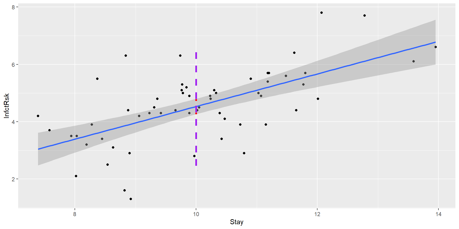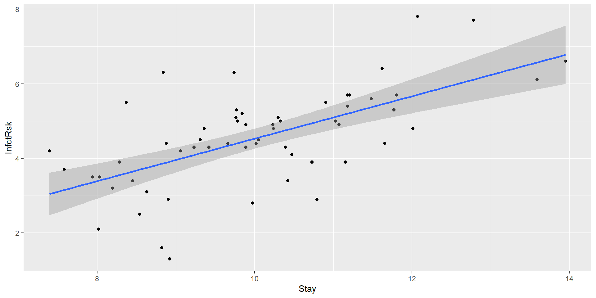 lm(formula = InfctRsk ~ Stay, data = hospital_infection)